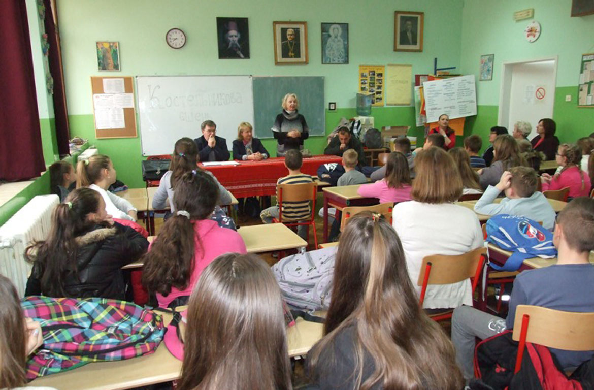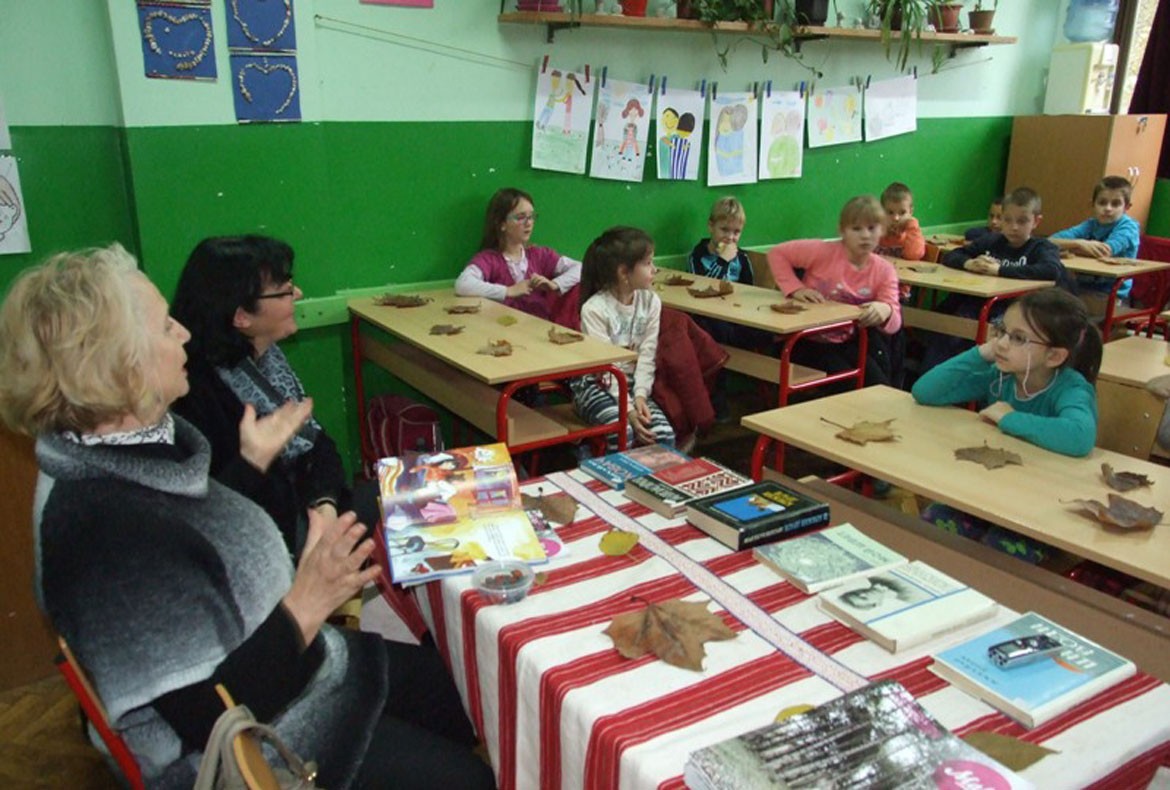 У ОШ „Братство єдинство”, на 11 годзин, директорка Славица Байор привитала госцох, после чого писателє Мелания Римар, Ирина Гарди Ковачевич и Микола Шанта зоз школярами нїзших класох побешедовали о писаним слове, о приповедкох, писньох, як и о наших писательох.