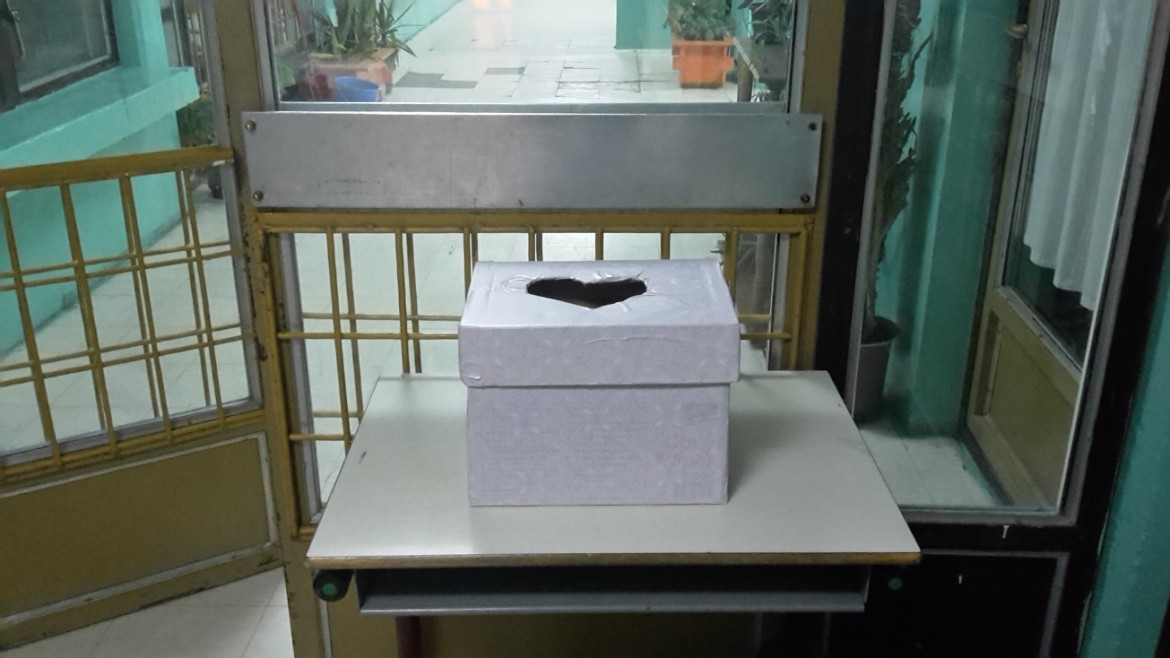 На уходзе до фискултурней сали находзела ше шкатула до котрей школяре пущали свойо добродзечни прилоги.