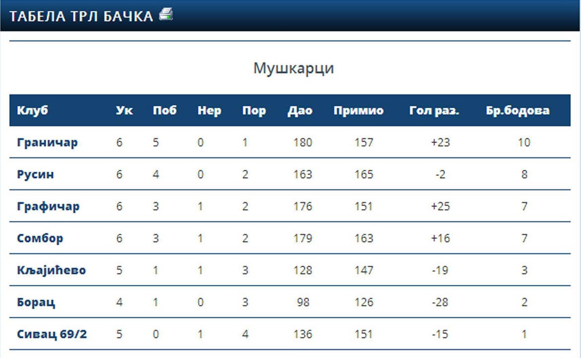 Найвецей ґоли дали Гербут (8) и Момич (8). На змаганю ище бавели Тома (3), Мудри (2), Боянович (2), Салак (1), Микита (1), Варґа (1), Виславски, Бабич, Гарди, Стойков и Надь, а екипу водзел Звонко Планчак. Зоз тим змаганьом рукометаше „Русину” закончели єшеньску часц першенства на другим месце на таблїчки з 8 бодами.