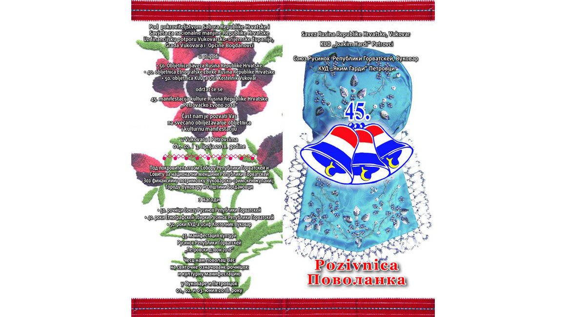 ПЕТРОВЦИ (РЕПУБЛИКА ГОРВАТСКА) – Централна манифестация култури Руснацох Републики Горватскей (РГ) „Петровски дзвон 2018”, 45. по шоре, будзе отримана наступного викенду, од 1-3. юний у Вуковаре и Петровцох.