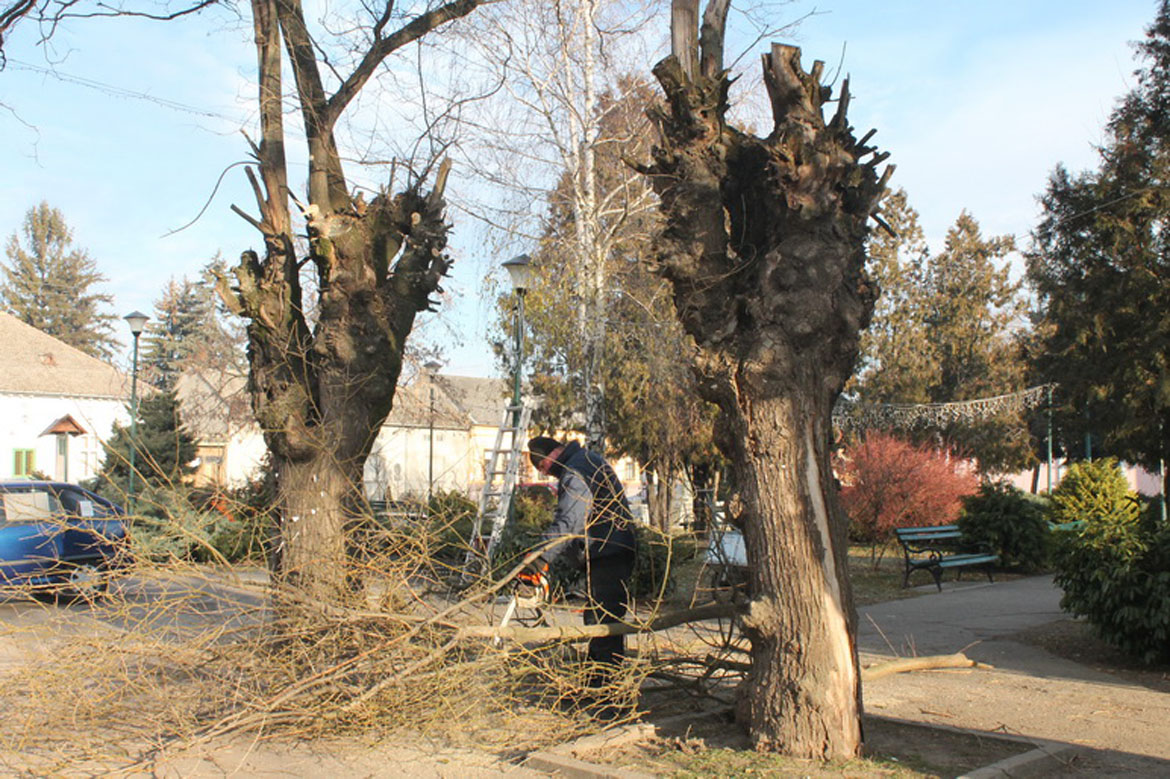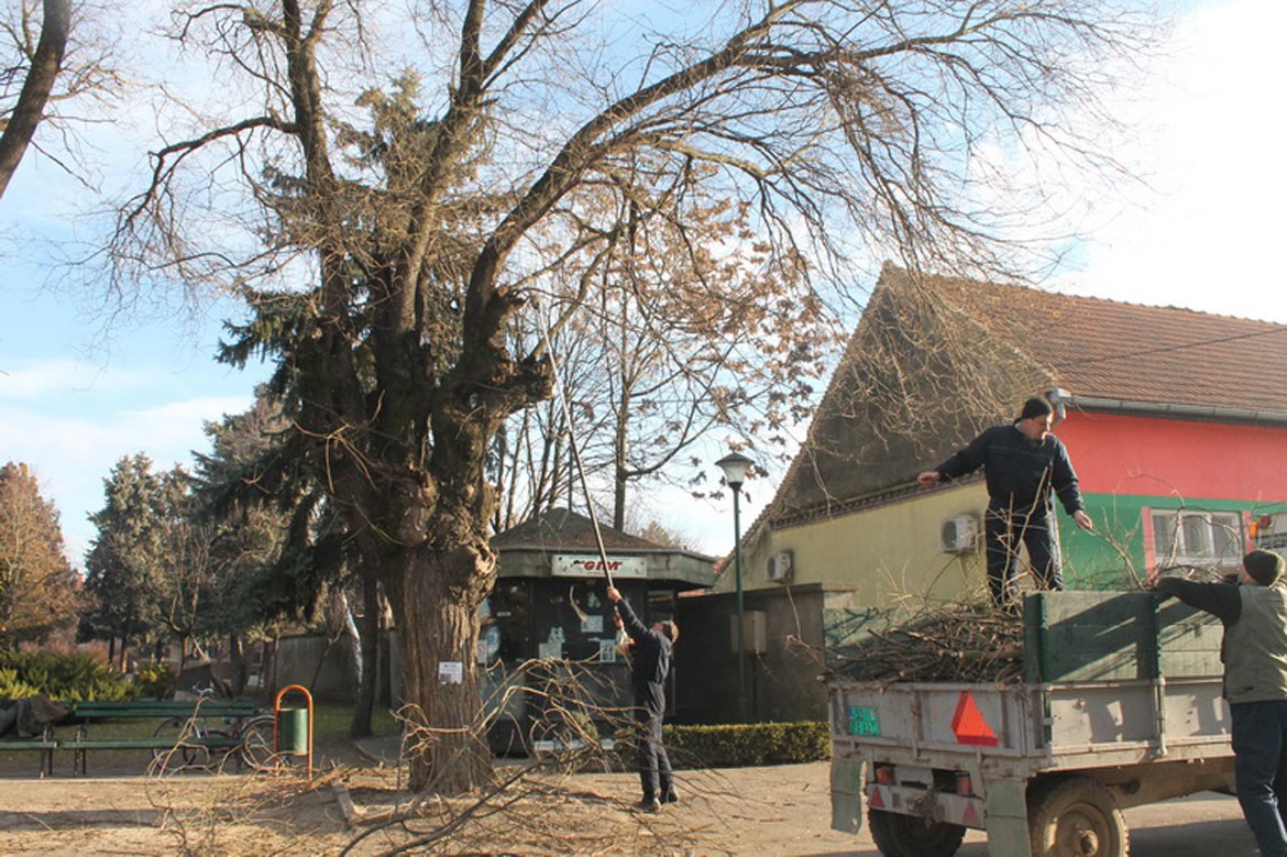 РУСКИ КРСТУР – Уређивање центра Руског Крстура је у пуном јеку, а ЈКП „Руском“ је јуче орезивао суве гране и формирао крошње на дрвећу које се налази испред парка.