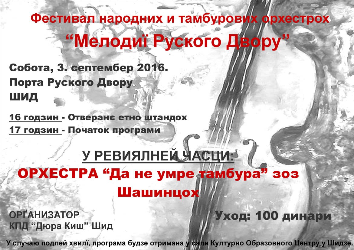 ШИД – Фестивал народних и тамбурових оркестрох „Мелодиї Руского двору” будзе отримани на соботу, 3. септембра, у порти Руского двору у Шидзе.