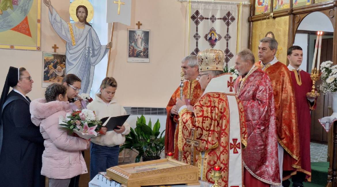 Пред початком Служби Божей владику зоз пригоднима словами и букетом квеца привитали три школярки котри ходза на виронауку.