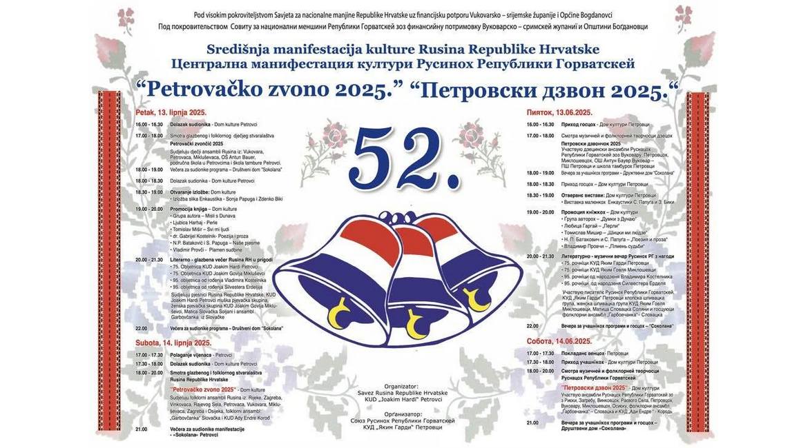 ПЕТРОВЦИ (ГОРВАТСКА) – На пияток и соботу, 13. и 14. юния будзе 52. централна манифестация култури Руснацох Републики Горватскей Петровски дзвон 2025.