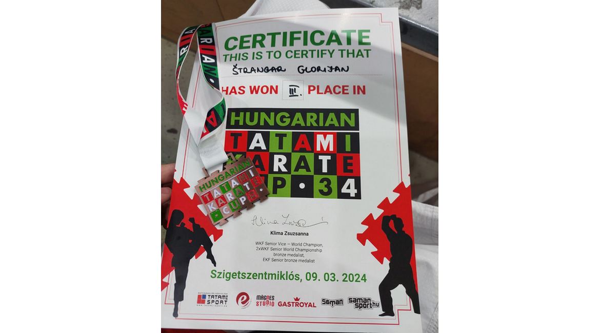 Тиж треба визначиц же всоботу, 9. марца у Будимпешти у Мадярскей отримани Медзинародни турнир „Hungarian tatami karate Cup” на хторим участвовал и Ґлориян Штранґар и зазначел одлични резултат, дзе у моцней конкуренциї завжал треце место и освоєл бронзову медалю. На тим турниру участвовало вецей як 700 змагательох зоз 19 державох, a KK „Гайдук” зоз Кули участвовал зоз 12 змагателями.